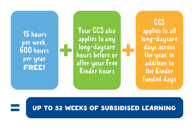 This is an additional subsidy from the Victorian Government that will apply to a portion of your fees after the Childcare Subsidy is applied. The percentage of CCS your family is entitled to for non-funded Kindergarten program hours will not change.